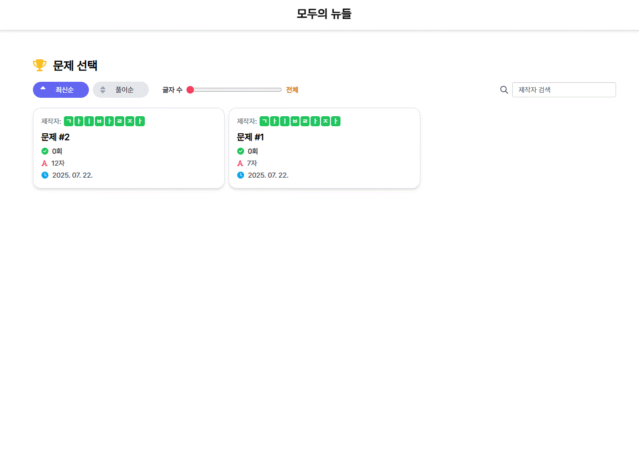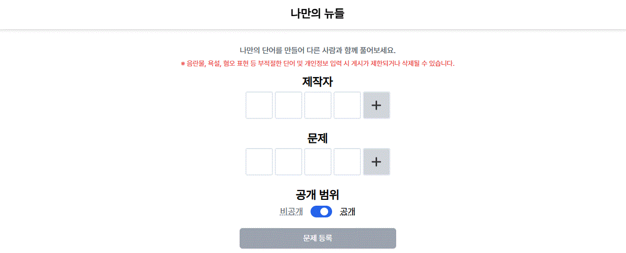 글자 수가 6자 또는 12자로 제한되어 있고, 생성된 문제는 URL을 통해서만 공유 가능하기 때문에 불특정 다수가 자유롭게 이용하기에는 불편함이 있었다.