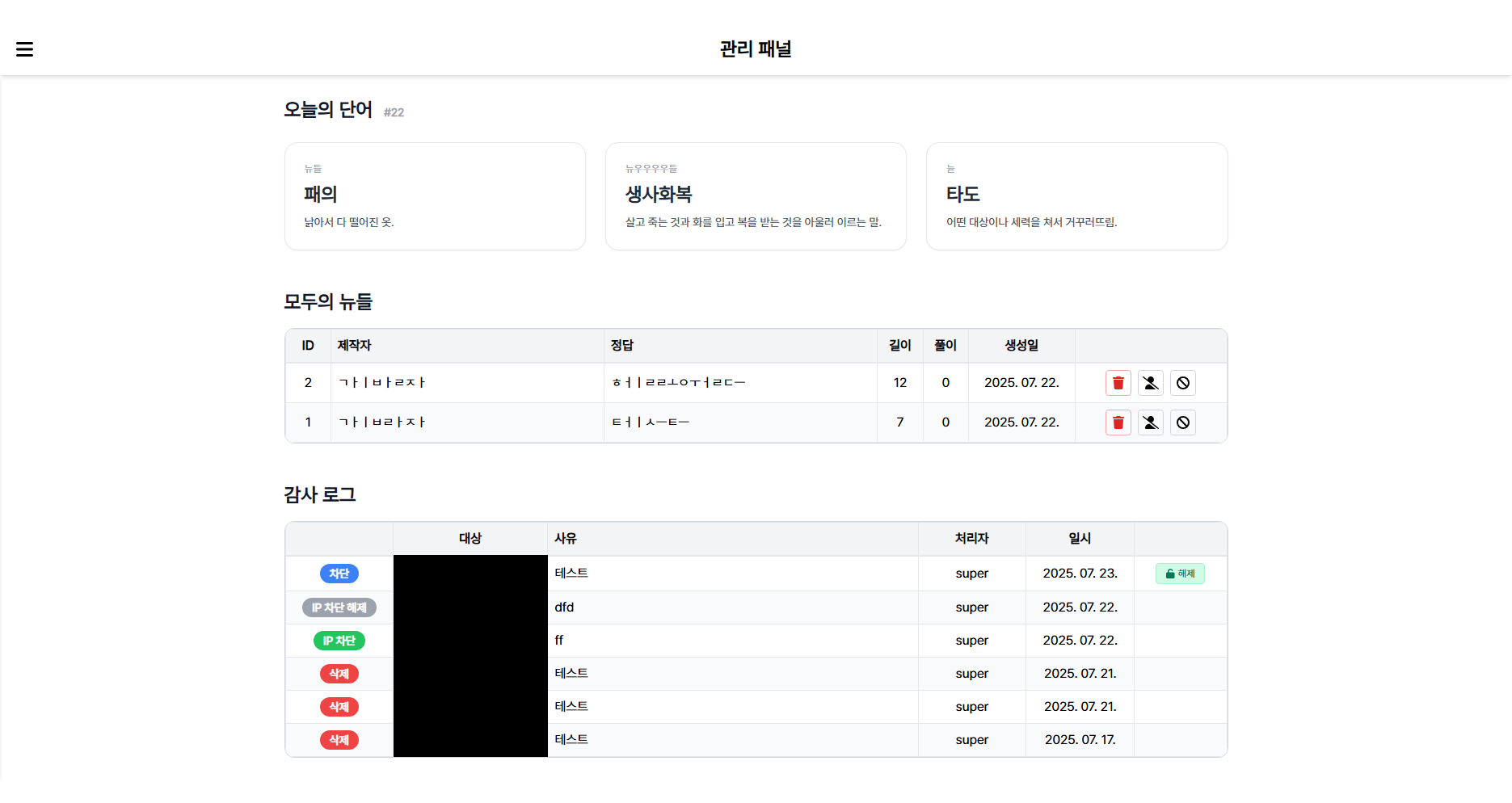 커스텀 단어 목록 및 관리, 특정 사용자/IP 차단, 감사 로그 확인 기능을 두어 관리가 용이하게 제작하였다.